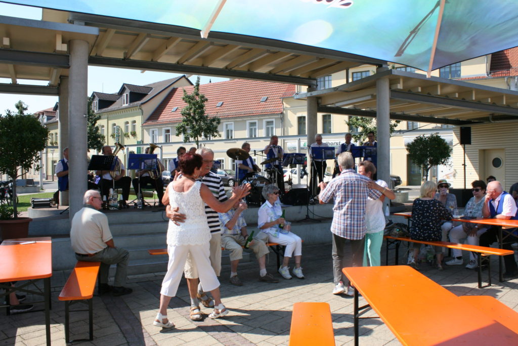Auf der Bühne gaben die Schwarzheider Musikanten ab 10:00 Uhr, trotz der Hitze und langer, coronabedingter Spielpause, alles für das begeisterte Publikum. „Das ist unser erster Auftritt seit März“, war von Roland Heidemüller (Kopf der Schwarzheider Musikanten) zu erfahren. Für das leibliche Wohl gab es echte Thüringer Rostbratwürste. Zur Erfrischung dienten den Zuschauern, die in den durch die Großschirme geworfenen Schatten und unter dem Bühnendach Sonnenschutz suchten, insbesondere Radler, Weinschorle und Wasser. Andere wiederum nutzen das kühle Nass des Elsterbrunnens um sich zu erfrischen. Nicht zuletzt war auch ein kleiner Windhauch zu spüren, als vor der Bühne sogar das Tanzbein geschwungen wurde.