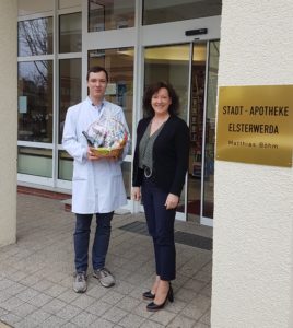 Bürgermeisterin Anja Heinrich gratuliert zur erfolgreichen Firmenübernahme, wünscht dem neuen Inhaber, Matthias Böhm von Herzen alles Gute und der Stadtapotheke und dem gesamten Team der Mitarbeiter eine erfüllte und erfolgreiche Zukunft.
