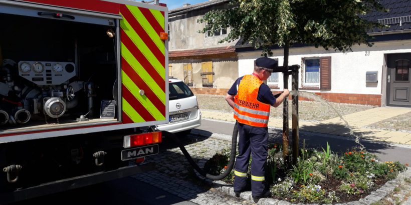 Jetzt erhielten sie tatkräftige Unterstützung durch die Freiwillige Feuerwehr Elsterwerda. Die Kameradinnen und Kameraden helfen ehrenamtlich in ihrer Freizeit bei der Bewässerung im Stadtgebiet.