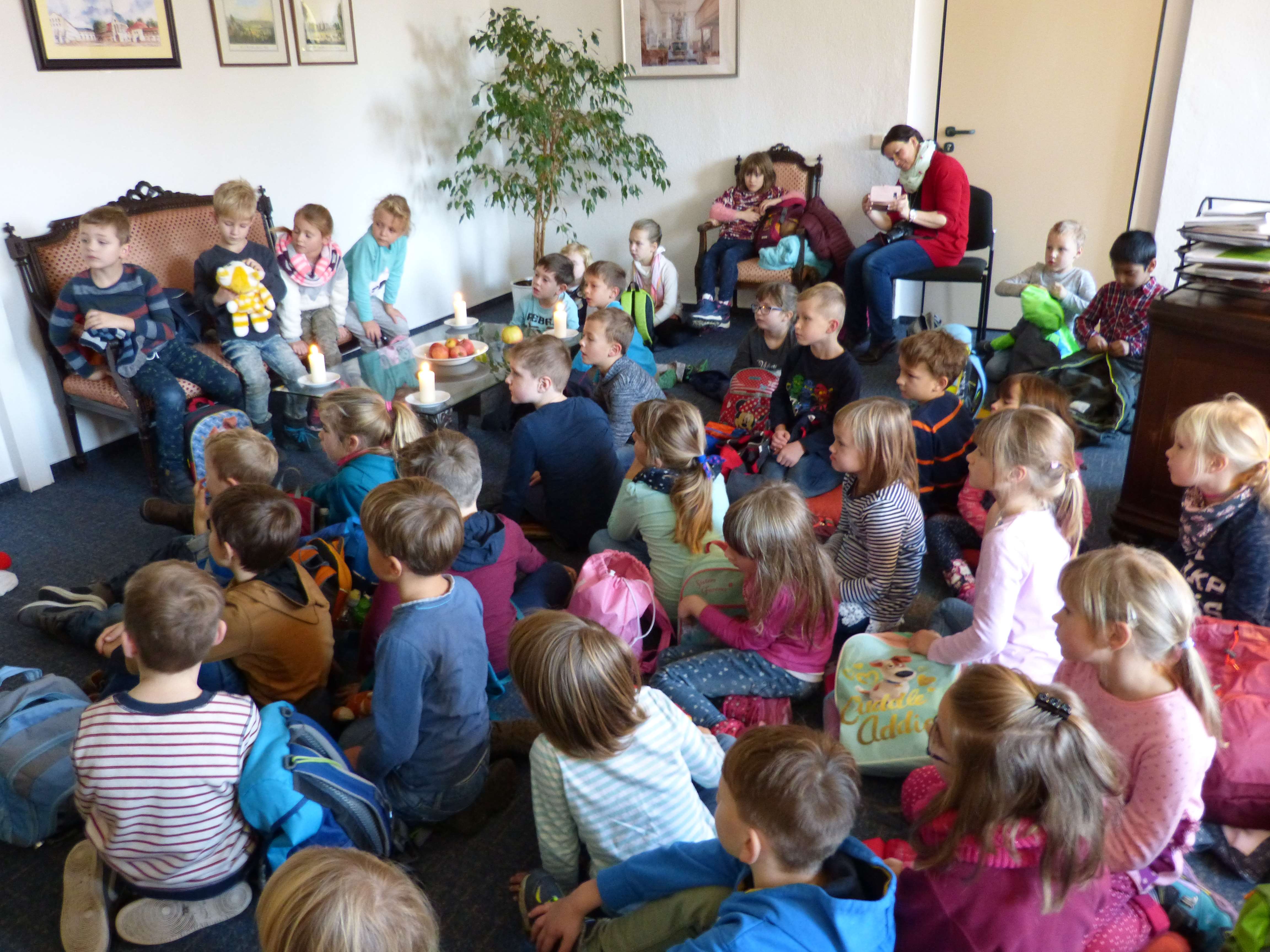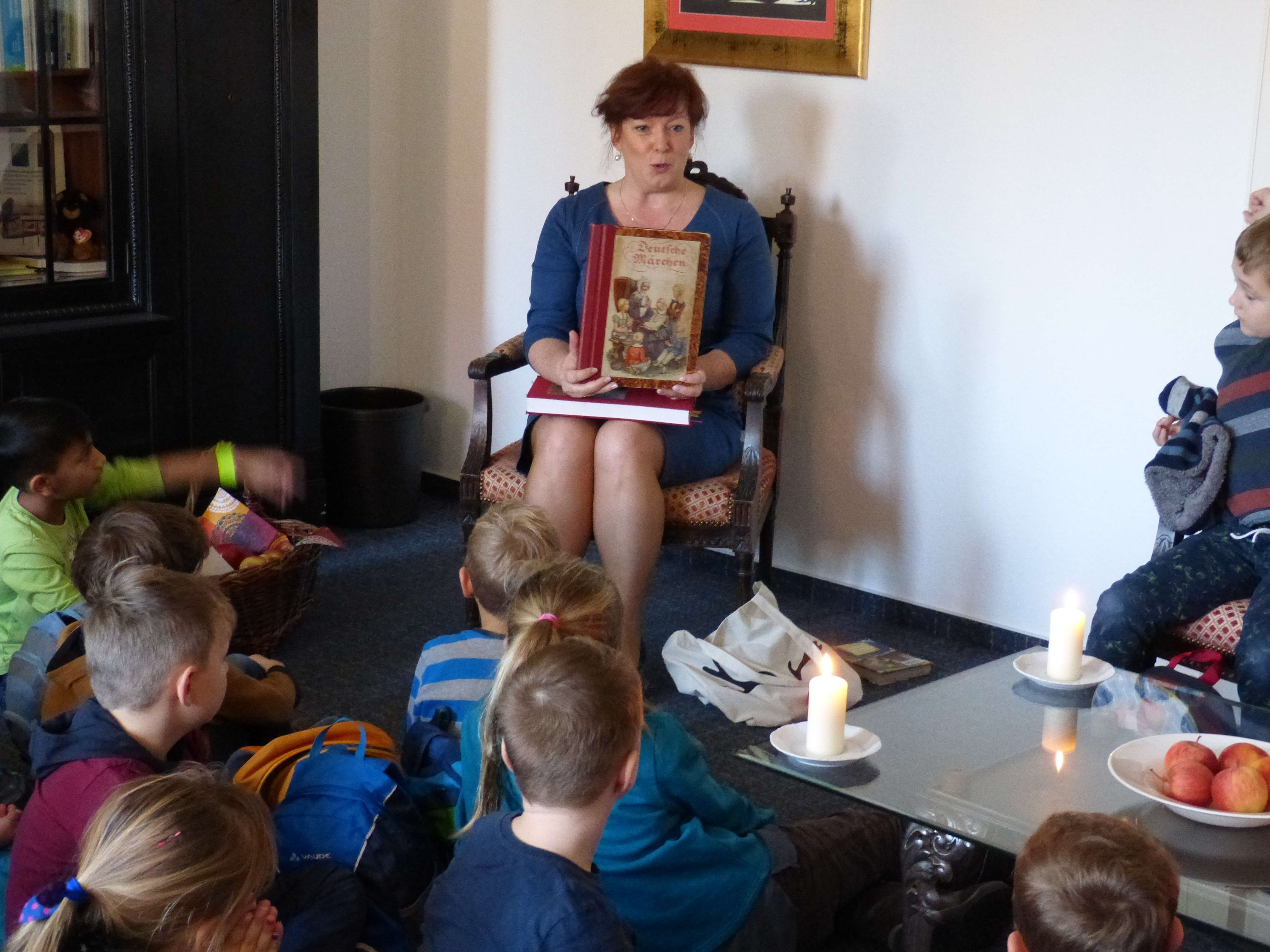 Mehr als 40 Kinder, Lehrer und Eltern fanden darin Platz, wurden bei Kerzenschein mit rotbäckigen Äpfeln und dem Bücherschatz der Büchermeisterin überrascht. Bei Geschichten aus dem reichen Fundus der Gebrüder Grimm träumten sich die Kinder in die Zauberwelt der Märchen und bedankten sich mit selbstgemalten Bilder und einer Leseurkunde bei Anja Heinrich und dem Team des Bürgermeisterbüros.