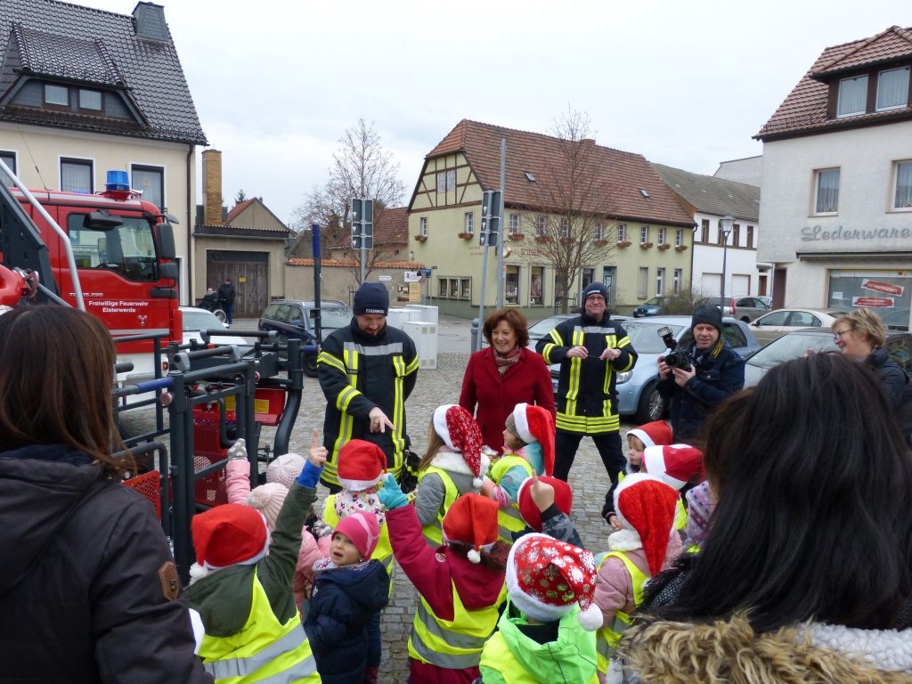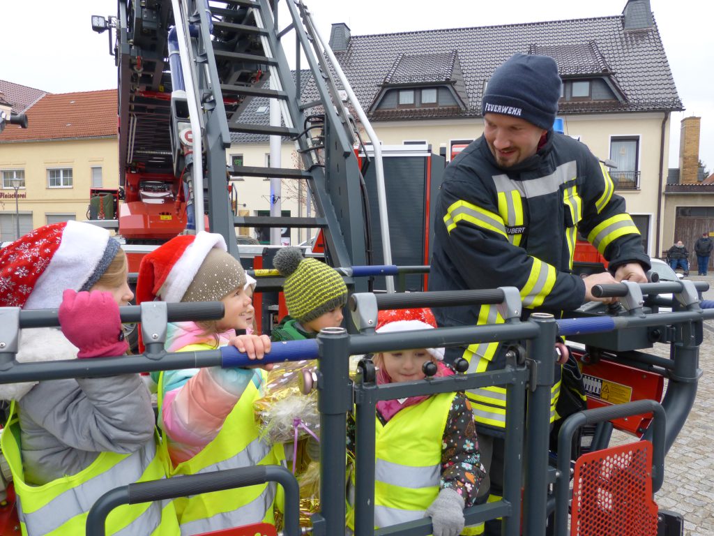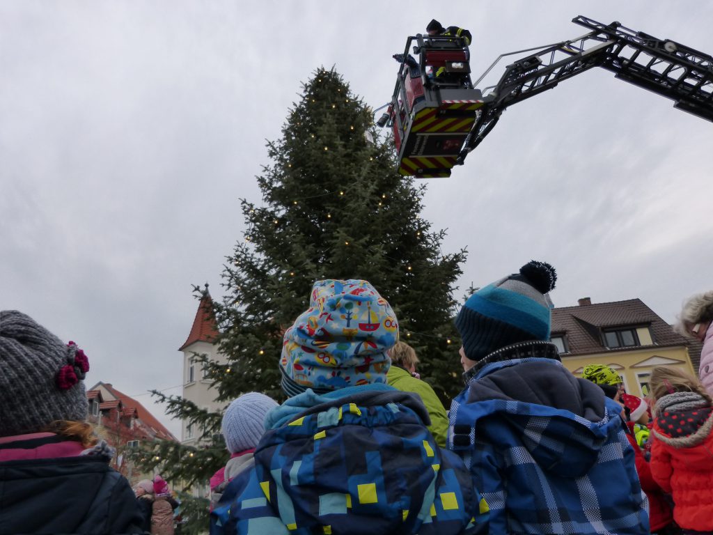 Unterstützt wurde diese schöne neue Tradition von der Freiwilligen Feuerwehr Elsterwerda. Stadtbrandmeister Uwe Petersen und Ortswehrführer Daniel Neubert erfüllten den ersten großen Kinderwunsch. So wurden die Pakete mit Hilfe der großen Drehleiter in luftiger Höhe an den Weihnachtsbaum gehangen. Bei stimmungsvoller Weihnachtsmusik und leckeren Mäuseplätzchen der Bäckerei Grafe erfreute der „Baum der Kinder“ mit seinem Schmuck und Lichterglanz nicht nur die Jüngsten, sondern auch die vorbeispazierenden Gäste und Zuschauer in der kommenden Adventszeit.