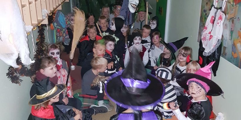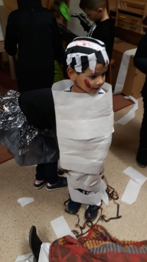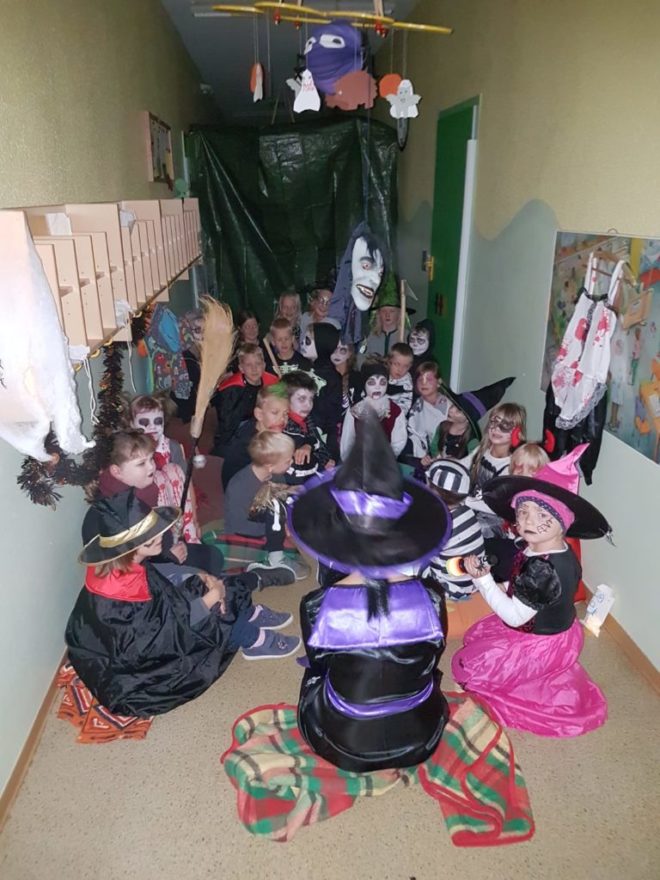 Am 30.10.2019 fand in unserer Kita ein schauriges Halloweenfest statt. Die Eltern bereiteten für die Kinder Gruselbowle und gruseliges Essen vor. 17 Uhr ging es dann los und die Kinder der Bären- und Hortgruppe kamen gruselig verkleidet in die Kita. Nach einer schaurigen Geschichte zur Einstimmung, starteten die lustigen Spielen. Als Erstes wurden einige Kinder zu Mumien eingewickelt, das war ein Spaß, nach einer kurzen Stärkung ging es weiter mit Stopp- Tanz und „Kleines armes Gespenst“ spielen.