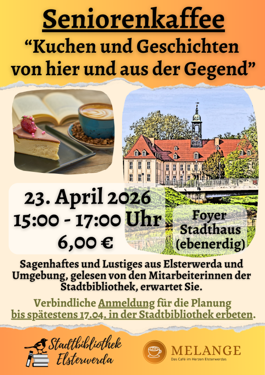 Für die Planung und Kuchenbestellung erbitten wir eine verbindliche Anmeldung bis spätestens 17.04.2026 in der Stadtbibliothek Elsterwerda.