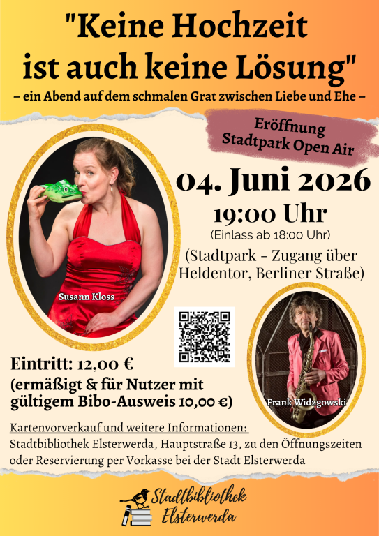 Karten erhalten Sie im Vorverkauf zu den bekannten Öffnungszeiten in der Stadtbibliothek Elsterwerda.