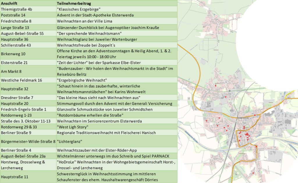 Wir freuen uns über die zahlreichen Anmeldungen zur Weihnachtsaktion der Stadt Elsterwerda und danken den Teilnehmern für Ihr Engagement und Ihre Freude am Gestalten der persönlichen Weihnachts-Sehenswürdigkeit.