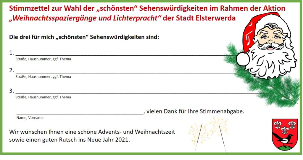 Nun ist es an Ihnen! Wählen Sie ihre drei liebsten Sehenswürdigkeiten und senden Sie uns den ausgefüllten Stimmzettel per Post oder E-Mail an Christiane Müller (kultursporttourismus@elsterwerda.de).